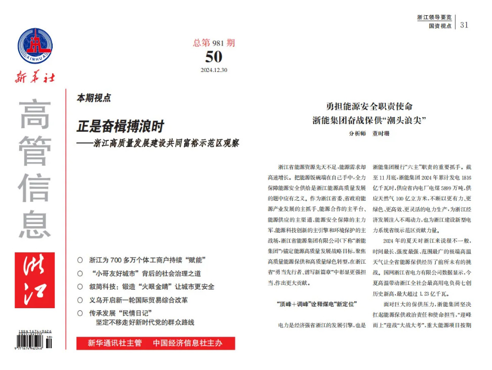 新華社《社高管信息》報道《勇擔能源安全職責使命 浙能集團奮戰(zhàn)保供“潮頭浪尖”》 新華社《社高管信息》 圖
