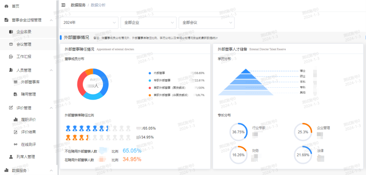 董事會運(yùn)行管理系統(tǒng)按省國資委管理要求研發(fā)部署,依據(jù)國資監(jiān)管機(jī)構(gòu)要求與企業(yè)章程,結(jié)合企業(yè)發(fā)展戰(zhàn)略和業(yè)務(wù)特點(diǎn),形成外部董事多維度畫像,深化預(yù)警提醒,前移監(jiān)督關(guān)口,可視化呈現(xiàn)各企業(yè)董事會建設(shè)、外部董事人才儲備等情況,實(shí)現(xiàn)預(yù)警在先、監(jiān)督有形,助力董事會規(guī)范性建設(shè)更高效、更智能。截至2023年底,董事會運(yùn)行管理系統(tǒng)已覆蓋省國資委及16家省屬企業(yè),累計(jì)錄入千余條會議數(shù)據(jù)與相關(guān)董事會議題數(shù)據(jù),以及百余條外部董事履職數(shù)據(jù),兼職外部董事庫中擁有百余位人才儲備。系統(tǒng)從使用便捷性、數(shù)據(jù)準(zhǔn)確性和數(shù)據(jù)實(shí)用性三方面著手,打造“好用、實(shí)用、管用”的董事會運(yùn)行管理數(shù)字化應(yīng)用。